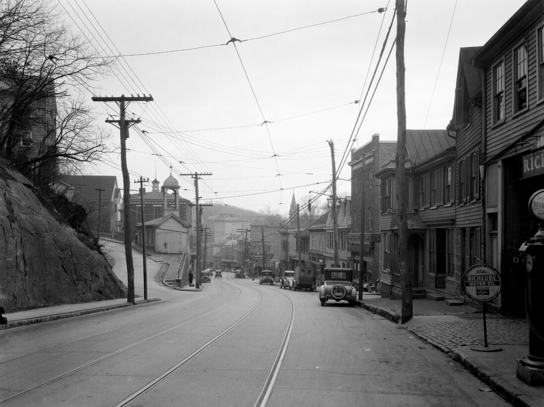 Ellicott City, founded in 1772, is listed on the National Register of Historic Places. This black-and-white photo of Ellicott City’s Main Street was taken by the Baltimore Gas and Electric Company in December 1930. On the left is the Ellicott City Firehouse, Howard County’s first firehouse, originally constructed in 1889. The firehouse later became a meeting hall in 1923. On the right of the photo, just in front of the vehicle parked on the street, is Hamilton Street. The structures to the right of the vehicle were torn down for the construction of a new post office in 1940. Today, the post office houses the Howard County Welcome Center.
